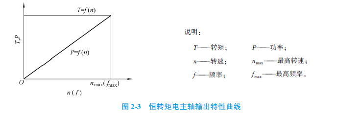 在電主軸調速全過程中, 電動機功率隨轉速呈線性變化, 而電動機轉矩恒定不變的電主軸。恒轉矩電主軸的最高轉速為額定轉速, 其輸出特性曲線如圖2-3 所示。磨用電主軸的電動機一般都是恒轉矩設計。