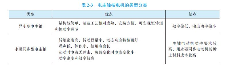 電主軸按電動機的類型可分為異步型電主軸和同步型電主軸。當前高速電主軸產品大部分都是內置異步交流感應電動機; 同步型電主軸多用永磁同步電動機。其各自的優缺點對比如表2-3 所示。